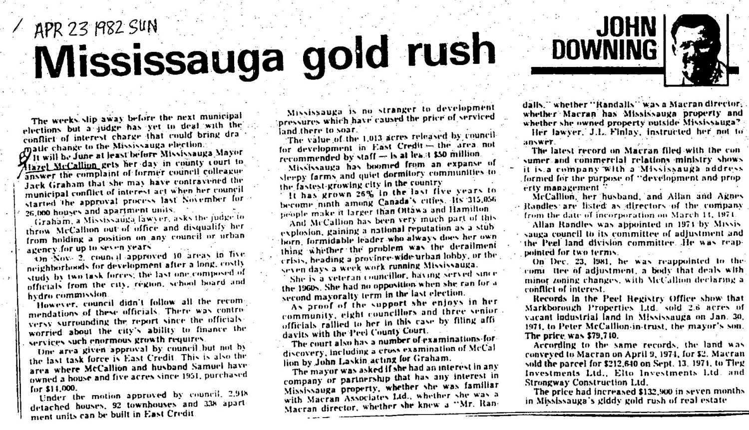 - This is the same property that Hazel McCallion was taken to court over only a few years before regarding her improper conduct - Conflict of Interest. Her business dealings are not open and highly questionable.