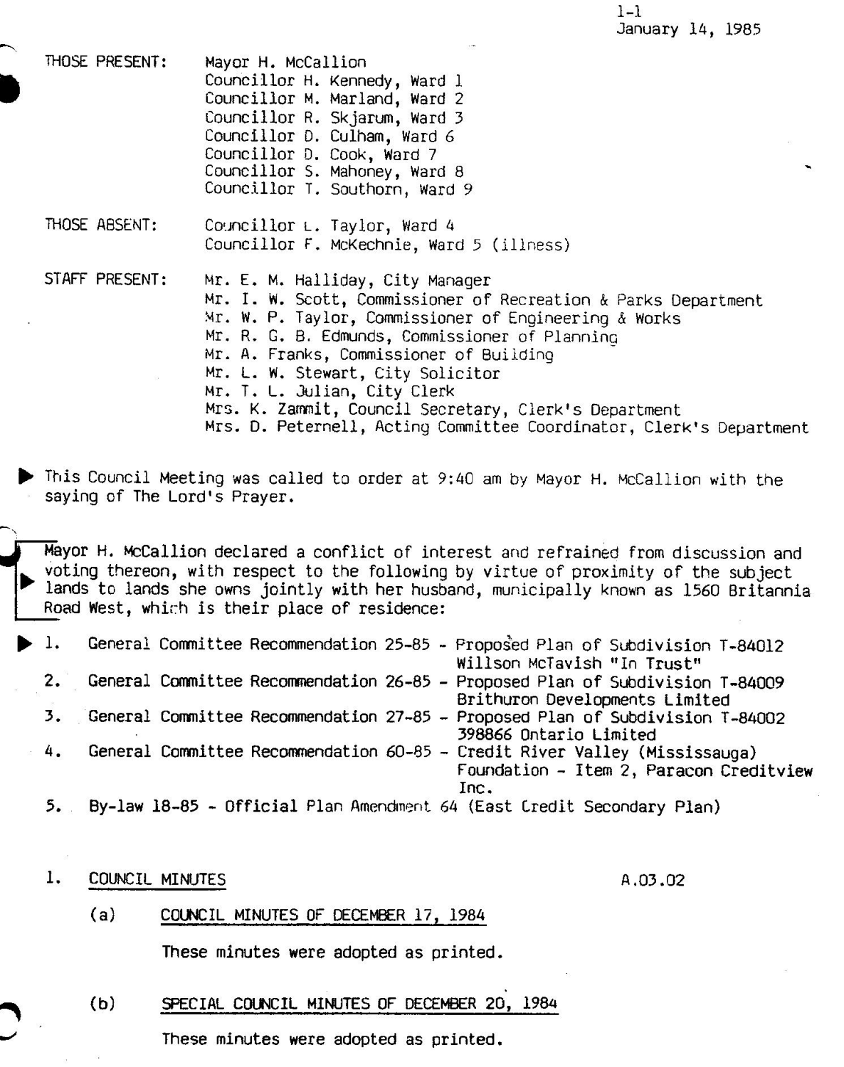 On Dec. 23, 1981, he was reappointed to the committee of adjustment, a body that deals with minor zoning changes, with McCallion declaring a conflict of interest.