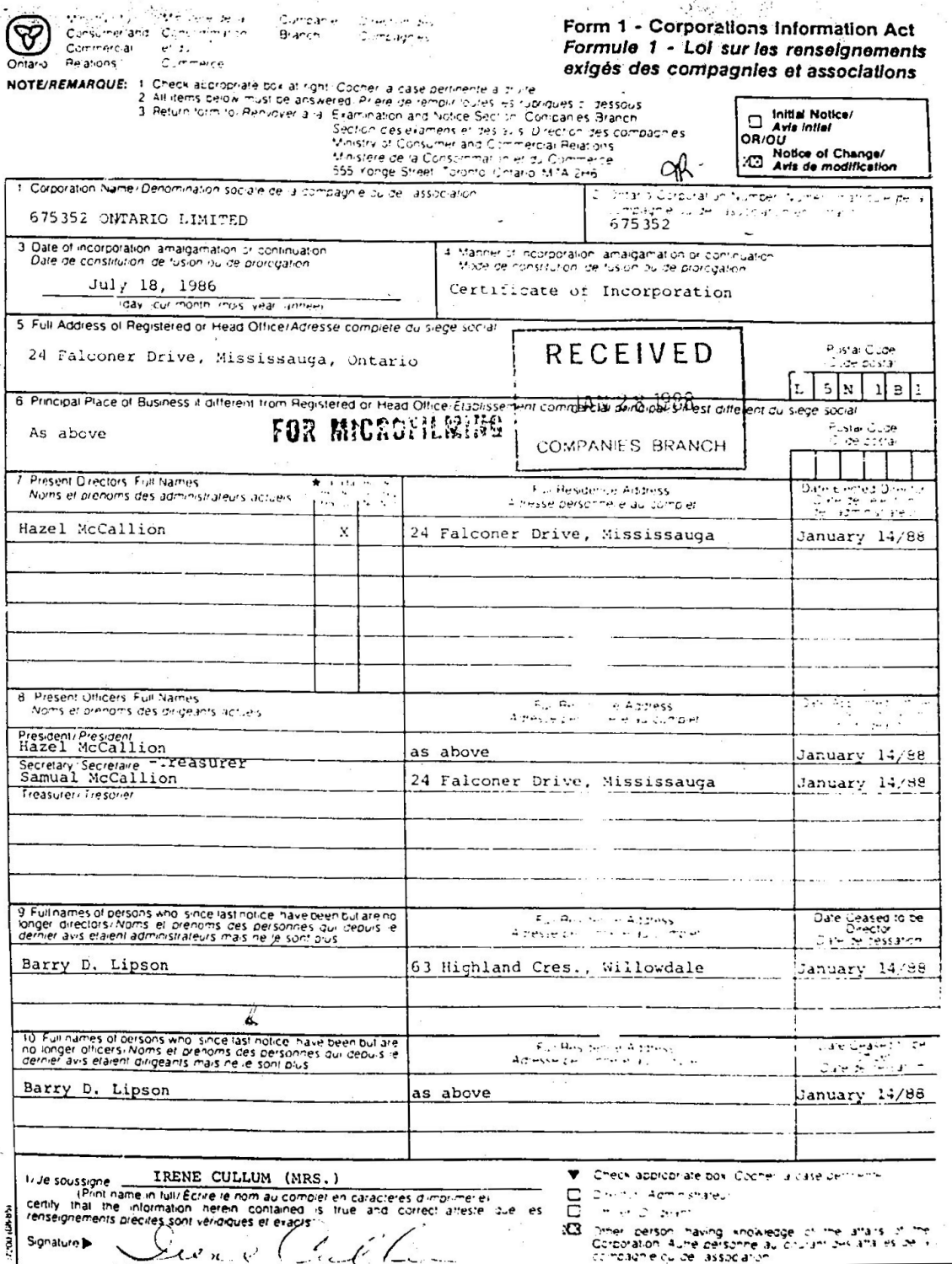 - Hazel McCallion lists herself as President of 675352 Ontario Limited, for an elected official to do so and after what has just happened regarding the same property, some would say that is very arrogant of her.