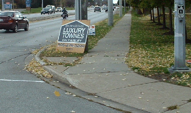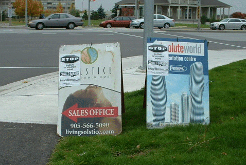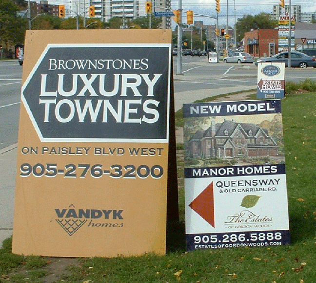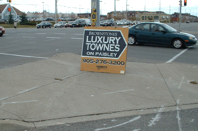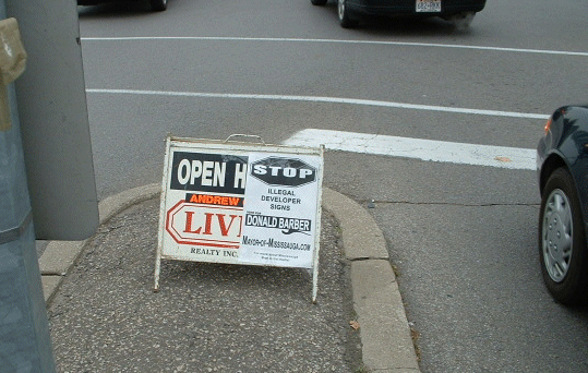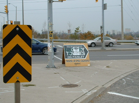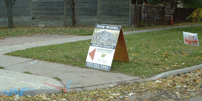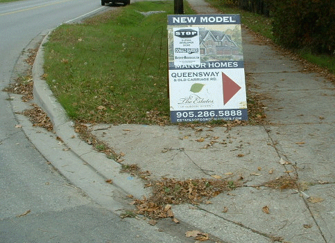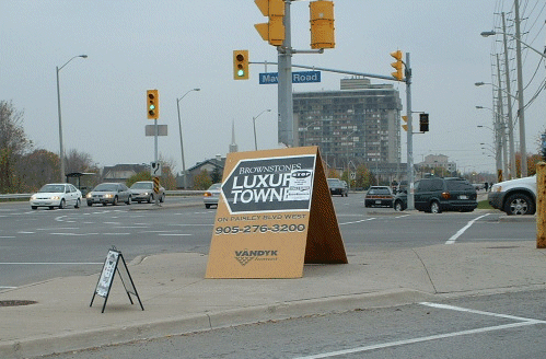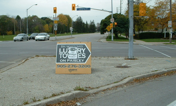 The City Sign By-law says no signs close to street corners & Section 25(3) of Sign by-law 54-2002 prohibits the display "New Home Developments Signs" on a traffic medians.