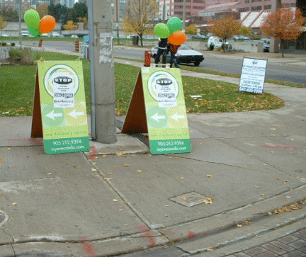 I just spoke to Daren Bryan and he was not too impressed with your email - showing him as the contact info for your email. He has advised me that regardless of the positioning of our A-frames, only the City of Mississauga has the authority to address the issue and or do anything about it. He also advised that I contact the Mississauga Police department in the event that you vandalize our A-Frames again. Post this on your website.