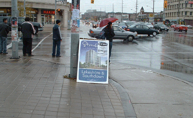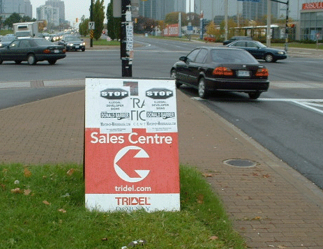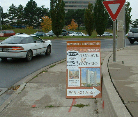 The most arrogant and indifference to the City sign By-law can be seen here. This developers sign is on City hall property, literally at the door closest to By-law enforcement! Right on the door step of By-law enforcement, shows the developer flipping the bird at City hall & the Mayor of Mississauga!
