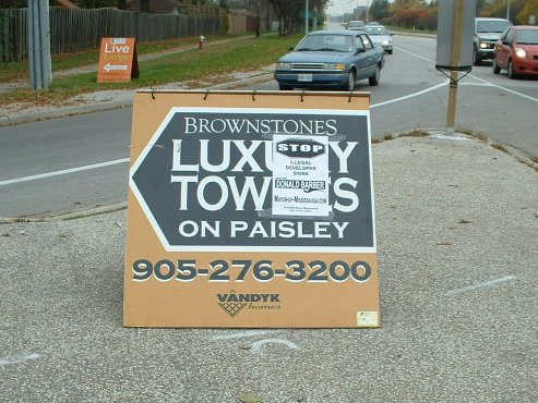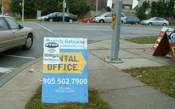 I have been trying to get Darren Bryan to remove developers a-frame signs (VANDYK Group of Companies, were one of the group noted). He would not send the City’s trucks out on the weekends to the locations noted by way of E-mail and in phone conversations. These signs were mocking the City’s Sign By-law in the most severe fashion as they were literally being put in the middle of the road! For some reason the developer felt they could totally disregard the City’s Sign By-law. It is common practice for these developers a-frame signs to pop up like mushrooms for just the weekends in Mississauga as City enforcement staff usually are not on duty, as they are during the week. It has also been told to me twice by By-law staff that the Mayor has told them not to touch developers signs.