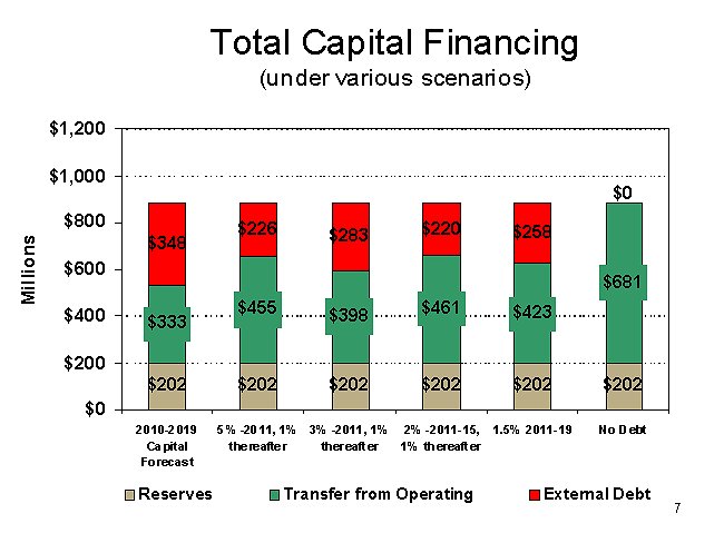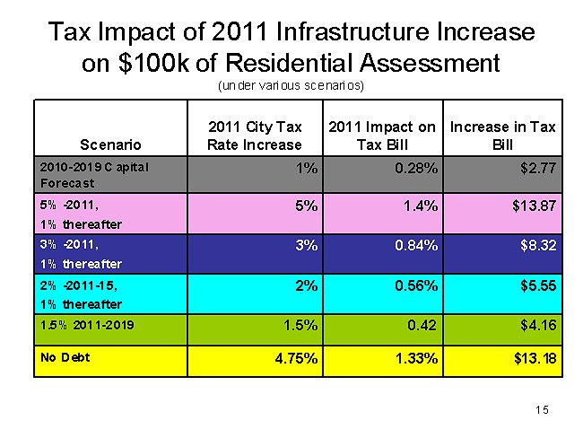 Rossini laid out two scenarios for dealing with the issue. In the first, the City spends all of its reserve funds to finance the work, including most of a $327 million fund it established when Hydro Mississauga was turned into a private company. Then, the City borrows the rest of the funds. That scenario would see taxes rise by one to 1.5 per cent annually to repay the debentures, beginning around 2010.