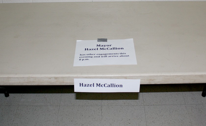 At the end (on time), a crowd to meet and get picture with the Mayor - what are we, spam sandwiches? Not listening to what said? John Briers, President Churchill Meadows Residents Association, Hazel McCallion & guess who getting in picture - again. |
